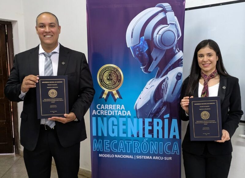 «Diseño, Modelado y Fabricación de Empaquetadora Automática de Frascos de Esmaltes de Uñas en Cajas de 6 Unidades», se denomina el Trabajo Final de Grado (TFG) presentado por los nuevos ingenieros Carolina Pineda Picco y Nicolás Franco Ocampos, como prueba final para egresar de la carrera de Ingeniería Mecatrónica de la Facultad de Ingeniería de la Universidad Nacional de Asunción (FIUNA). La defensa del trabajo se realizó el lunes 22 de Diciembre del 2025 en la Institución.
