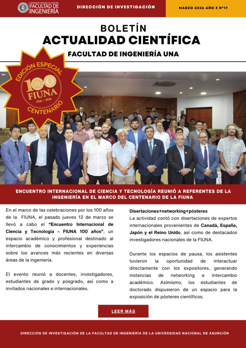 La Facultad de Ingeniería de la Universidad Nacional de Asunción (FIUNA) presenta la decimoséptima edición del boletín “Actualidad Científica”, correspondiente al mes de marzo de 2026, en una edición especial en el marco del centenario institucional, disponible para toda la comunidad académica y para el público interesado en ciencia, tecnología e innovación.