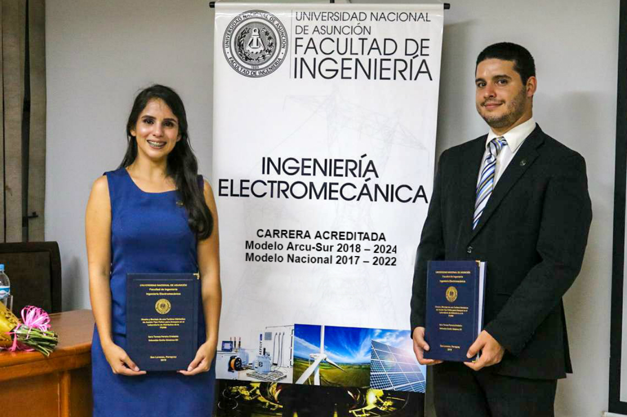 “Diseño y montaje de una turbina de acción tipo Pelton para el Laboratorio de Hidráulica de la Facultad de Ingeniería“, se denomina la presentación del Trabajo Final de Grado (TFG) que presentaron los ahora ingenieros Sara Teresa Pereira Cristaldo y Sebastián Emilio Giménez Gil, como última prueba para egresar de la carrera de Ingeniería Electromecánica de la Facultad de Ingeniería de la Universidad Nacional de Asunción (FIUNA). La exitosa defensa del trabajo se realizó el pasado viernes 22 de febrero en la Institución.
