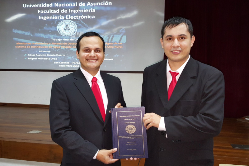 “Monitoreo Inalámbrico y Sistema de Detección de Pérdidas de Agua de un Sistema de Distribución de Agua Potable en el Casco Urbano de un Área Rural” se titula el trabajo presentado por Cesar Augusto Duarte y Miguel Mendieta, como trabajo final de grado para culminar sus estudios de ingeniería electrónica en la Facultad de Ingeniería de la Universidad Nacional de Asunción (FIUNA).