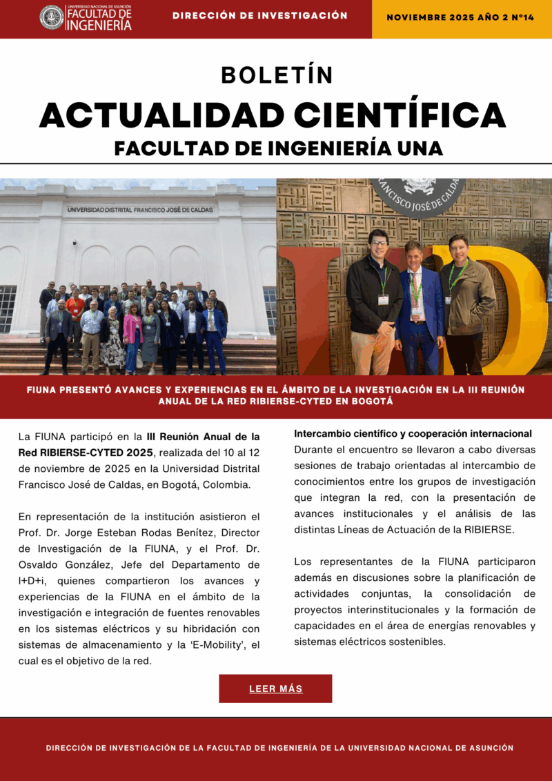 La Facultad de Ingeniería de la Universidad Nacional de Asunción (FIUNA) presenta la decimocuarta edición del boletín “Actualidad Científica”, correspondiente al mes de noviembre de 2025, disponible para toda la comunidad académica y el público interesado en ciencia, tecnología e innovación.