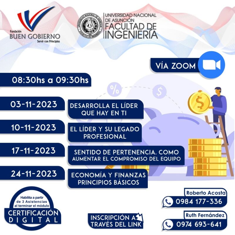 El Departamento de Desarrollo, Capacitación y Evaluación Administrativa, dependiente de la Dirección de Gestión de Talento Humano de la Facultad de Ingeniería de la Universidad Nacional de Asunción (FIUNA) invita a directivos, colaboradores de la Institución y público en general a participar de los Cursos de capacitación impartidos por la Fundación Buen Gobierno (FBG), en el marco del Convenio de Cooperación Interinstitucional. Se desarrollarán en la modalidad virtual por medio de la plataforma ZOOM.