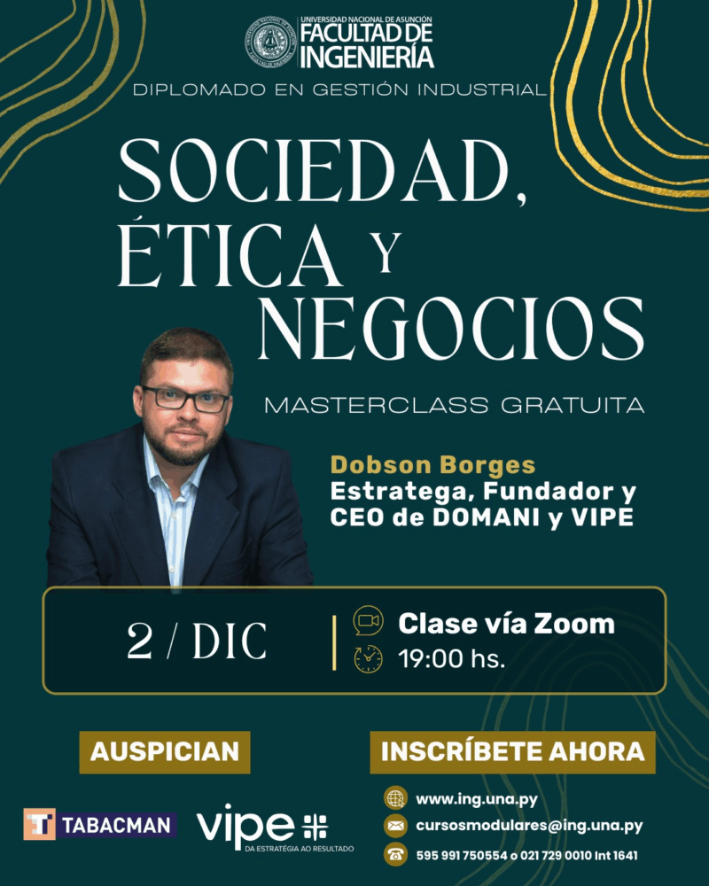 En el marco del Diplomado en Gestión Industrial de la Facultad de Ingeniería de la Universidad Nacional de Asunción (FIUNA) se invita a participar de la Masterclass gratuita “Sociedad Ética y Negocios”. Se realizará hoy martes 02 de Diciembre, a las 19:00 hs, vía Zoom.
