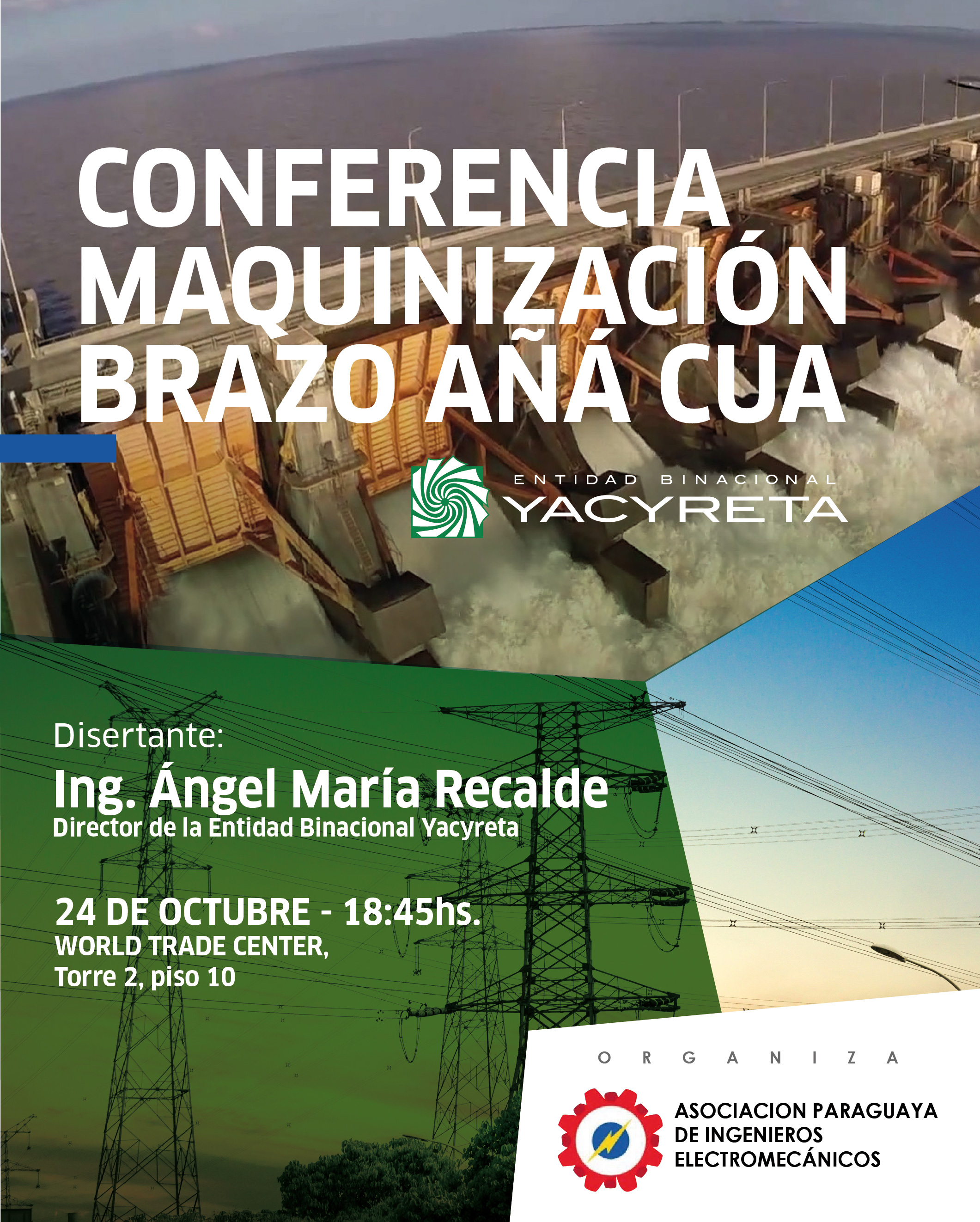 La Asociación Paraguaya de Ingenieros Electromecánicos (ASOPIEM) organiza e invita a participar de la Conferencia «Maquinización Brazo Añá Cua», que realizará el martes 24 de octubre de 2017 a las 18:45 hs en el 10º piso, Torre 2 del Edificio World Trade Center, Asunción -Paraguay. Estará como disertante el Ing Ángel María Recalde, Director de la Entidad Binacional Yacyretá. El objetivo del evento es crear un espacio debate sobre el proyecto luego de la disertación del Ing. Recalde. Dirigido al público interesado y el acceso es gratuito.
