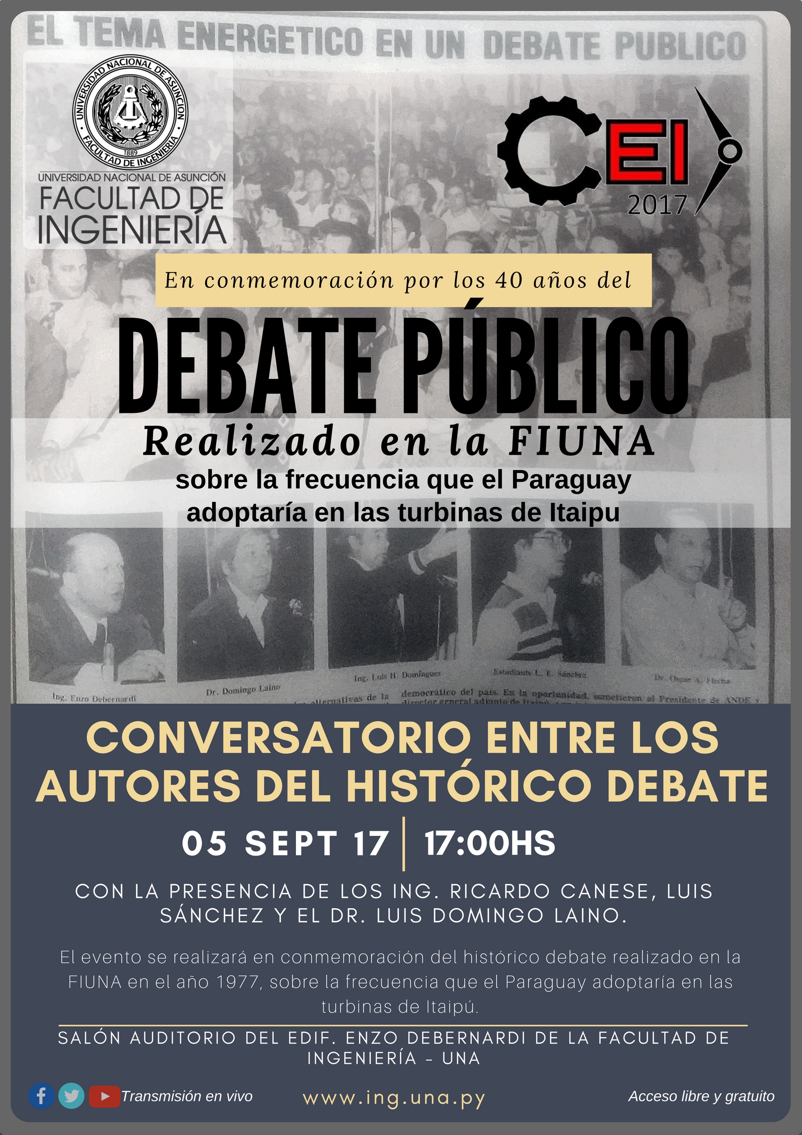 <![CDATA[En Conmemoración por los 40 años del Primer Debate público televisado en vivo realizado en la FIUNA, la Facultad de Ingeniería de la Universidad Nacional de Asunción (FIUNA) y el Centro de Estudiantes (CEI), invitan a estudiantes, docentes y al público en gral., a participar del «Conversatorio entre los autores de aquel histórico debate, sobre la frecuencia que el Paraguay adoptaría en las turbinas de Itaipú». El evento se realizará el martes 05 de septiembre a las 17:00hs en el Salón Auditorio del Edif. «Enzo Debernardi» de la Institución.
