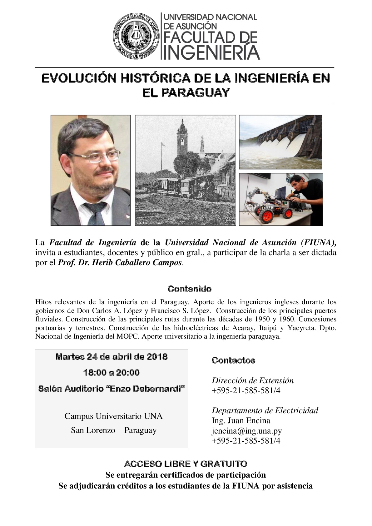 <![CDATA[La Facultad de Ingeniería de la Universidad Nacional de Asunción (FIUNA), invita a estudiantes, docentes y público interesado, a participar de la Charla sobre la «Evolución Histórica de la Ingeniería en el Paraguay», que se realizará el próximo martes 24 de abril a las 18:00hs en el Salón Auditorio del Edificio «Enzo Debernardi» de la Institución. Estará como disertante el Prof. Dr. Herib Caballero Campos, quien es Profesor Asistente de la Facultad de Derecho y Ciencias Sociales, UNA; y Docente Investigador de la Universidad Nacional de Canindeyú.