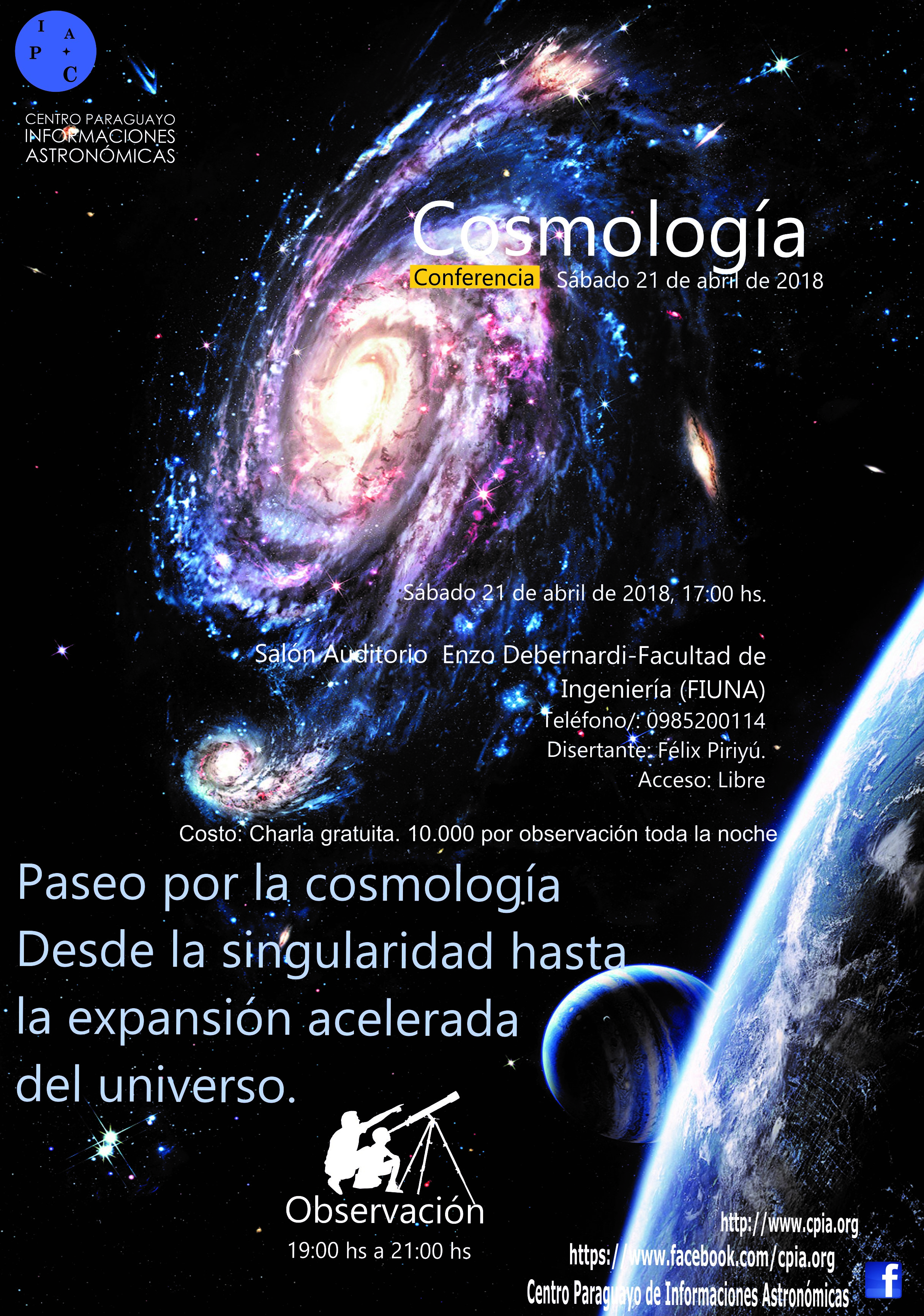 <![CDATA[El Centro Paraguayo de Informaciones Astronómicas invita a participar de la Conferencia «Paseo por la cosmología desde la singularidad hasta la expansión acelerada del universo», a realizarse el sábado 21 de abril del corriente a las 17:00 hs en el Salón Auditorio del Edificio «Enzo Debernardi» de la Facultad de Ingenieria de la Universidad Nacional de Asunción (FIUNA).