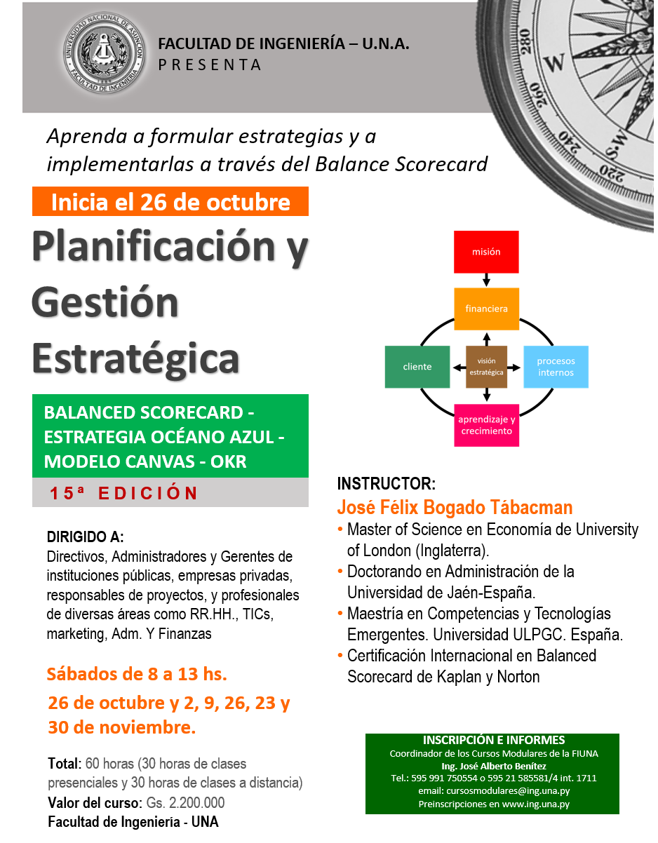 <![CDATA[La Facultad de Ingeniería de la Universidad Nacional de Asunción (FIUNA), invita a participar de la 15ª Edición del Curso de Planificación y Gestión Estratégica con la herramienta Balanced Scorecard (BSC), para instituciones públicas y privadas, en el marco del Programa de la Maestría en Ingeniería Industrial de la FIUNA. En el curso los estudiantes podrán aprender tanto el marco conceptual como la forma práctica de aplicar lo que está considerado a nivel internacional como el “state of the art” en lo que se refiere no solo a planificar sino a cómo ejecutar la estrategia. En ese sentido, los participantes podrán aprender a construir y articular sus estrategias utilizando el Balanced Scorecard y los Mapas Estratégicos, permitiendo traducir la estrategia en términos operativos, al mismo tiempo de alinear las diversas unidades de la organización en torno a la estrategia previamente consensuada. Dirigido a Directores, Administradores, Gerentes de Instituciones públicas y privadas, responsables de proyectos y profesionales de diversas áreas como RRHH, TICs, Marketing, Administración y Finanzas. Tiene el propósito de fortalecer en ellos la capacidad gerencial que les permita mejorar la gestión con miras al logro de los objetivos de los programas y proyectos. El curso posee una duración de 60 horas cátedra y será desarrollado por el Dr. José Félix Bogado Tábacman, Doctorando en Administración de la Universidad de Jaén – España, Master of Science en Economía, de University of London (Inglaterra), Master en Competencias y Tecnologías Emergentes. Universidad Las Palmas de Gran Canaria (ULPGC). España. Las clases se desarrollarán en la Institución los días sábados de 8:00 a 13:00 hs iniciando el 26 de octubre.