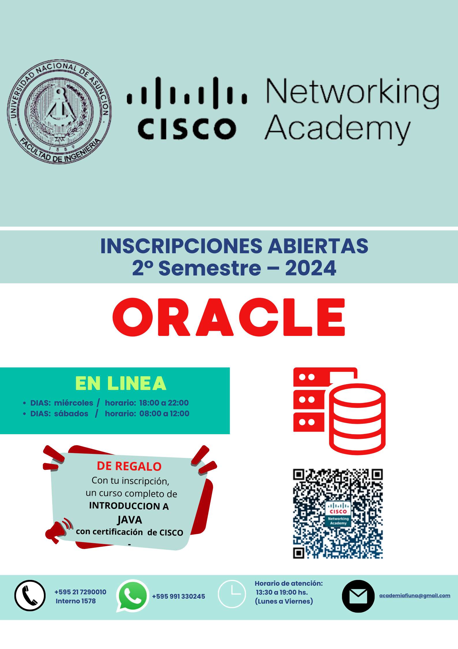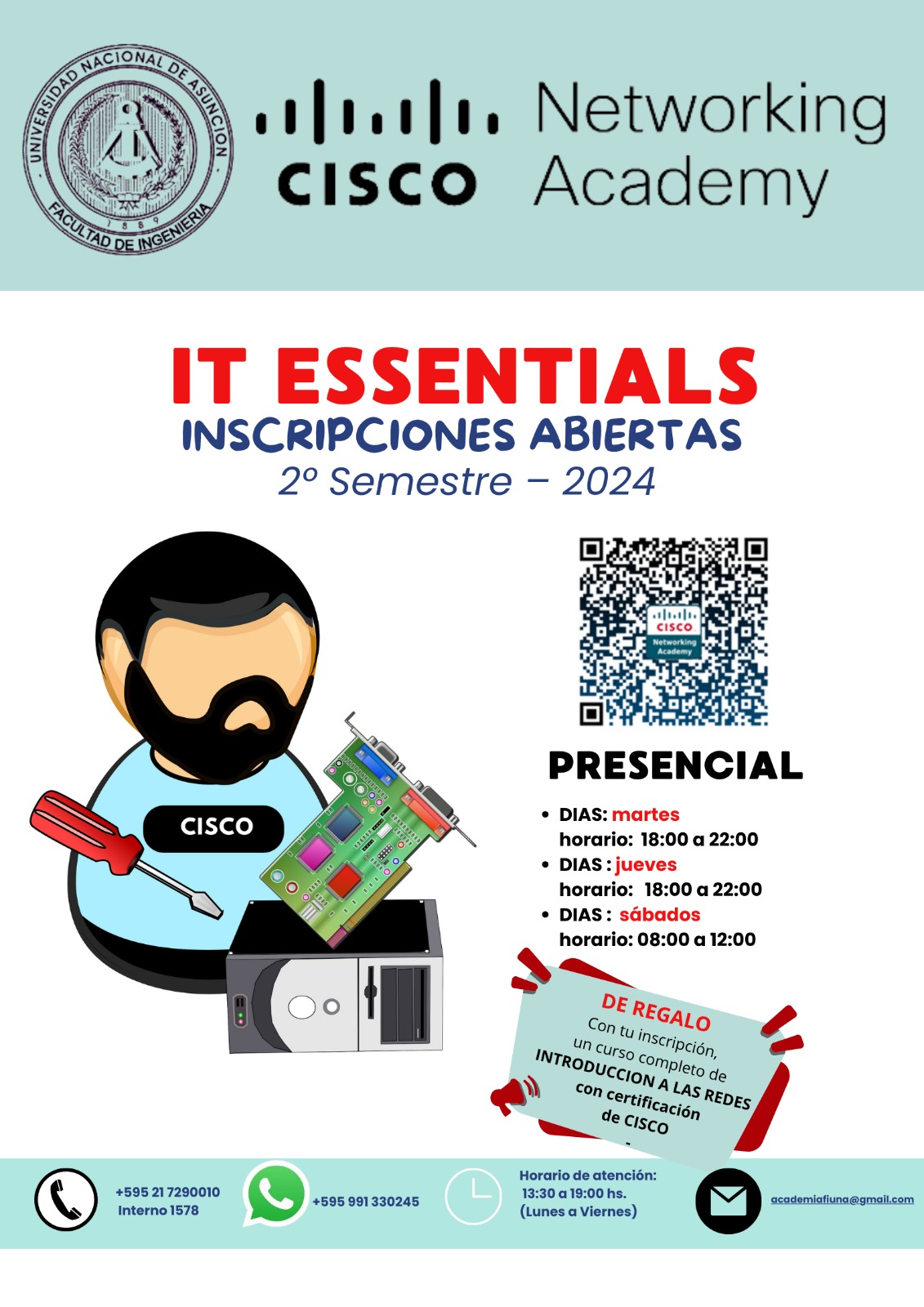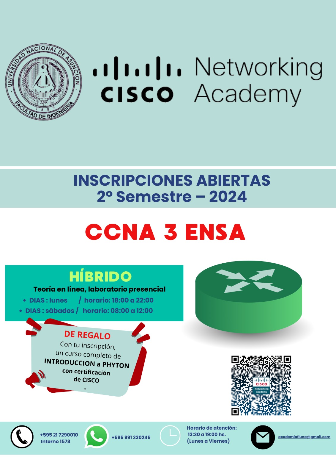 La Dirección de Extensión de la Facultad de Ingeniería de la Universidad Nacional de Asunción – FIUNA, informa que están abiertas las inscripciones a los cursos ofrecidos por la Academia CISCO/FIUNA correspondientes al 2° semestre del 2024.