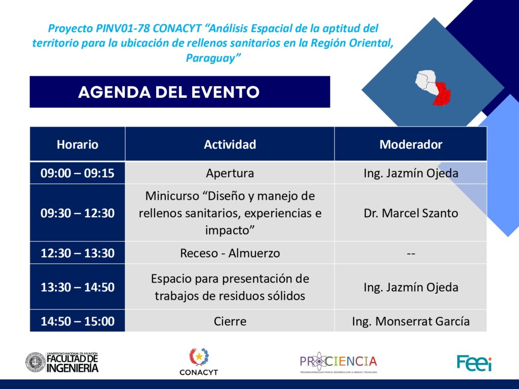 En el marco del Proyecto PINV01-78: “Análisis espacial de la aptitud del territorio para la ubicación de rellenos sanitarios en la Región Oriental, Paraguay”, ejecutado por la Facultad de Ingeniería de la Universidad Nacional de Asunción (FIUNA) y cofinanciado por el Consejo Nacional de Ciencia y Tecnología (CONACYT), se invita a participar del Taller – Curso sobre Diseño y manejo de rellenos sanitarios, experiencias e impacto.