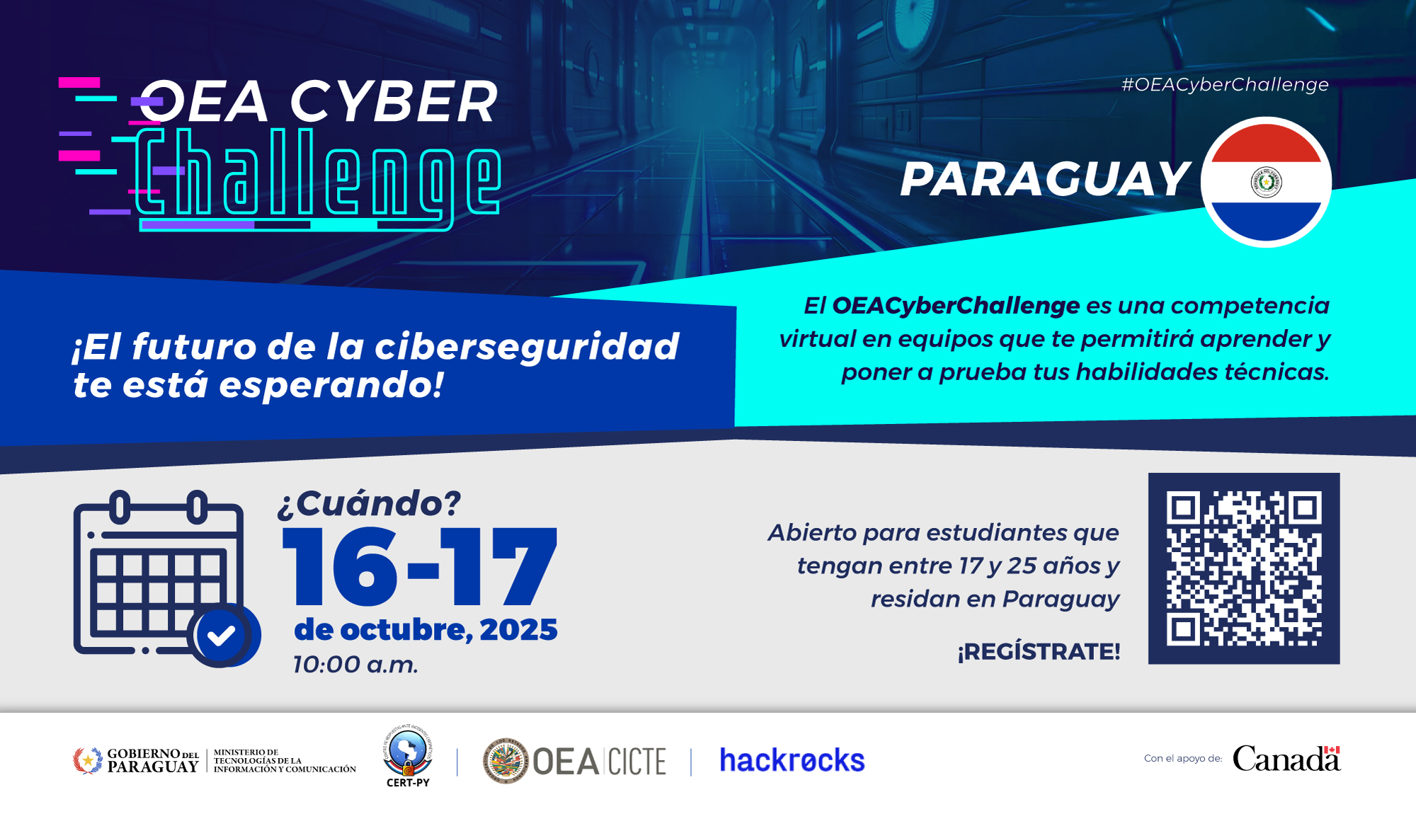 Se invita a participar de una competencia de ciberseguridad denominada “OEA Cyber Challenge Paraguay», dirigida a estudiantes que tengan entre 17 y 25 años y residan en el Paraguay. La competencia tendrá lugar del jueves 16 al viernes 17 de octubre, de 10:00 a 10:00 hs. Durante 24 horas, los participantes podrán completar los desafíos a su propio ritmo en forma individual o en equipos.