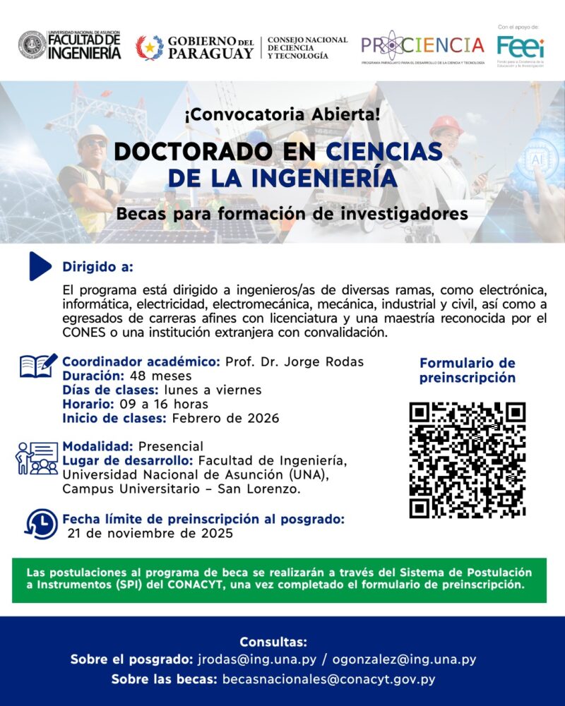 La Facultad de Ingeniería de la Universidad Nacional de Asunción (FIUNA) invita a profesionales del área a postularse a la segunda cohorte del Doctorado en Ciencias de la Ingeniería, un programa de excelencia que ofrece becas completas financiadas por el Consejo Nacional de Ciencia y Tecnología (CONACYT) para los estudiantes admitidos. El programa fue adjudicado en el marco de la tercera convocatoria del instrumento “Proyectos de Creación y Fortalecimiento de Maestrías y Doctorados de Excelencia”, del Programa PROCIENCIA II, respaldado por el Fondo para la Excelencia de la Educación y la Investigación (FEEI), según la Resolución N.º 547/2025 del CONACYT.