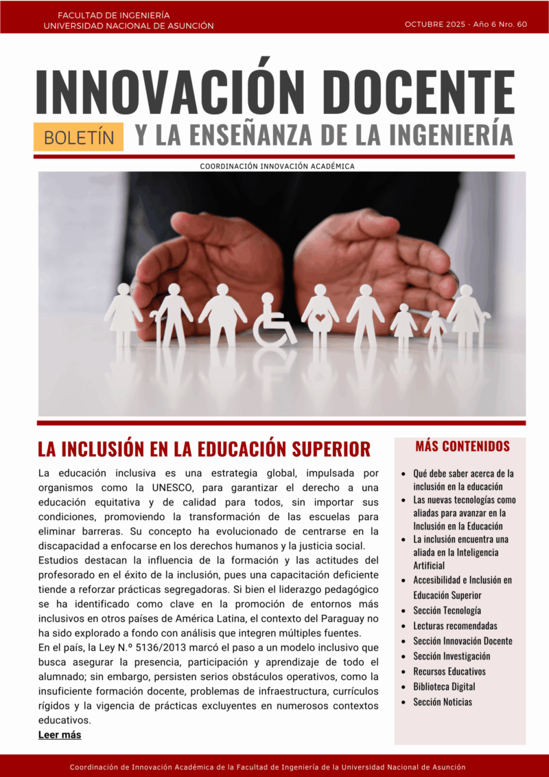 En este número el tema es: La Inclusión en la Educación Superior. Se destaca a la educación inclusiva como una estrategia global, impulsada por organismos como la UNESCO, para garantizar el derecho a una educación equitativa y de calidad para todos. Aunque Paraguay ha adoptado un modelo inclusivo con la Ley N.º 5136/2013 , el boletín subraya la persistencia de serios obstáculos operativos, como la insuficiente formación docente, problemas de infraestructura y currículos rígidos. Por ello, se insiste en la urgencia de realizar una revisión sistemática en el país para unificar el conocimiento, evaluar avances y orientar de manera efectiva futuras políticas inclusivas, especialmente crucial para la enseñanza de la Ingeniería.