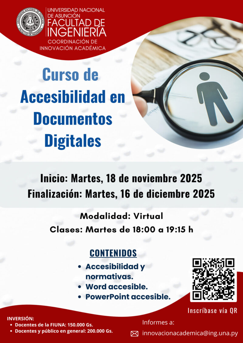 El próximo martes, 18 de noviembre de 2025 iniciará el “Curso de Accesibilidad en Documentos Digitales”, dirigido a docentes y funcionarios de la Facultad de Ingeniería de la Universidad Nacional de Asunción (FIUNA), así como a docentes de la Educación Superior en general. La actividad es organizada por la Coordinación de Innovación Académica de FIUNA.