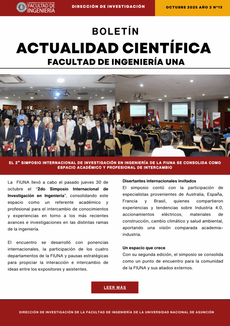 La Facultad de Ingeniería de la Universidad Nacional de Asunción (FIUNA) presenta la décimo tercera edición del boletín Actualidad Científica, correspondiente al mes de octubre de 2025, disponible para toda la comunidad académica y el público interesado en ciencia, tecnología e innovación.