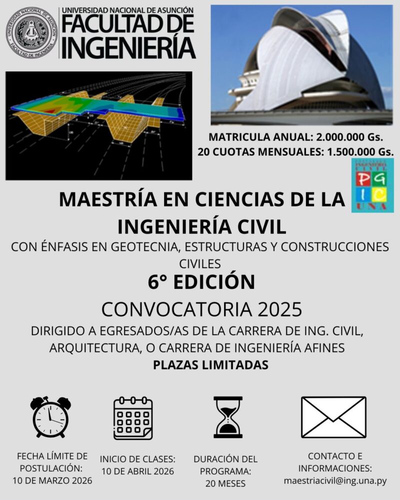 La Facultad de Ingeniería de la Universidad Nacional de Asunción (FIUNA) convoca a los interesados en postular para la Maestría en Ciencias de la Ingeniería Civil con énfasis en Estructuras, Geotecnia y Construcciones Civiles, Convocatoria 2025. La presente convocatoria es la 6ta edición de la Maestría en Ciencias de la Ingeniería Civil.