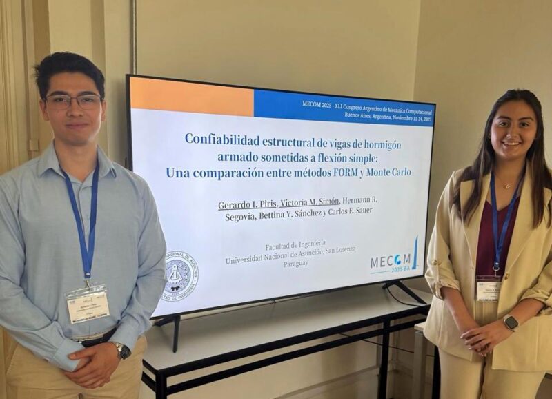 Los egresados, Ing. Victoria Simon e Ing. Gerardo Piris, de la carrera de Ingeniería Civil de la Facultad de Ingeniería de la Universidad Nacional de Asunción (FIUNA), presentaron los resultados del trabajo de investigación desarrollado en el marco del Trabajo Final de Grado (TFG) en el artículo titulado «Confiabilidad Estructural de Vigas de Hormigón Armado Sometidas a Flexión Simple: Una Comparación entre Métodos FORM y Monte Carlo», en el Congreso Internacional MECOM 2025.