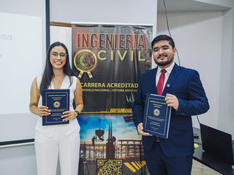 «Implementación de sistemas urbanos de drenaje sostenible (SUDS) en una cuenca de la ciudad de Asunción», se denomina el Trabajo Final de Grado (TFG) presentado por los ahora ingenieros Alan Rodrigo Báez Flores y María de Fátima Martínez López, como prueba final para egresar de la carrera de Ingeniería Civil de la Facultad de Ingeniería de la Universidad Nacional de Asunción (FIUNA). La defensa del trabajo se realizó el martes 23 de Diciembre del 2025 en la Institución.