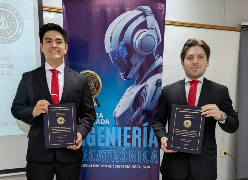 «Diseño e Implementación de una Bancada de Prueba para un Sistema Empacador Automático de Productos para el Laboratorio de Automatización y Robótica de la Facultad de Ingeniería de la Universidad Nacional de Asunción», se denomina el Trabajo Final de Grado (TFG) presentado por los ahora ingenieros Rurik Maximiliano Butlerov Taboada y Jun Ramón Galeano Miyasaki, como prueba final para egresar de la carrera de Ingeniería Mecatrónica de la Facultad de Ingeniería de la Universidad Nacional de Asunción (FIUNA). La defensa del trabajo se realizó el martes 30 de Diciembre del 2025 en la Institución.