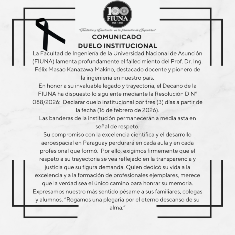 La Facultad de Ingeniería de la Universidad Nacional de Asunción (FIUNA) lamenta profundamente el fallecimiento del Prof. Dr. Ing. Félix Masao Kanazawa Makino, destacado docente y pionero de la ingeniería en nuestro país. En honor a su invaluable legado y trayectoria, el Decano de la FIUNA ha dispuesto lo siguiente mediante la Resolución D Nº 088/2026: