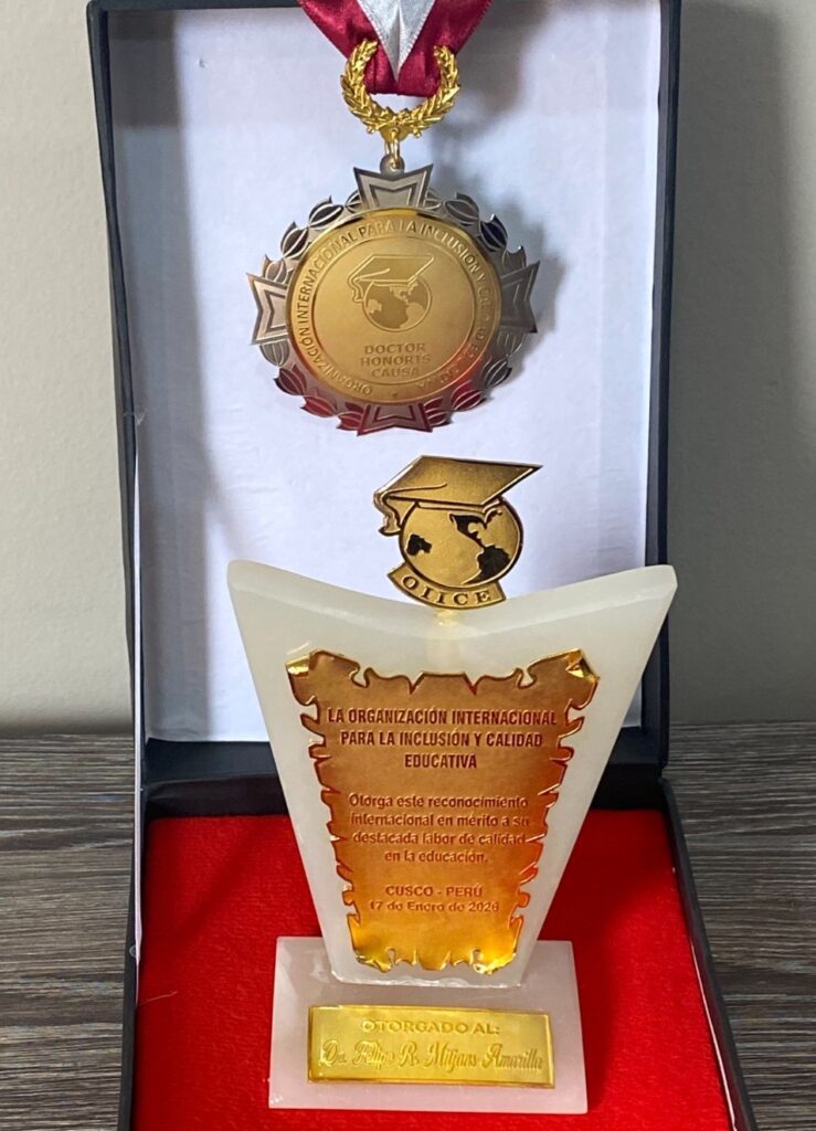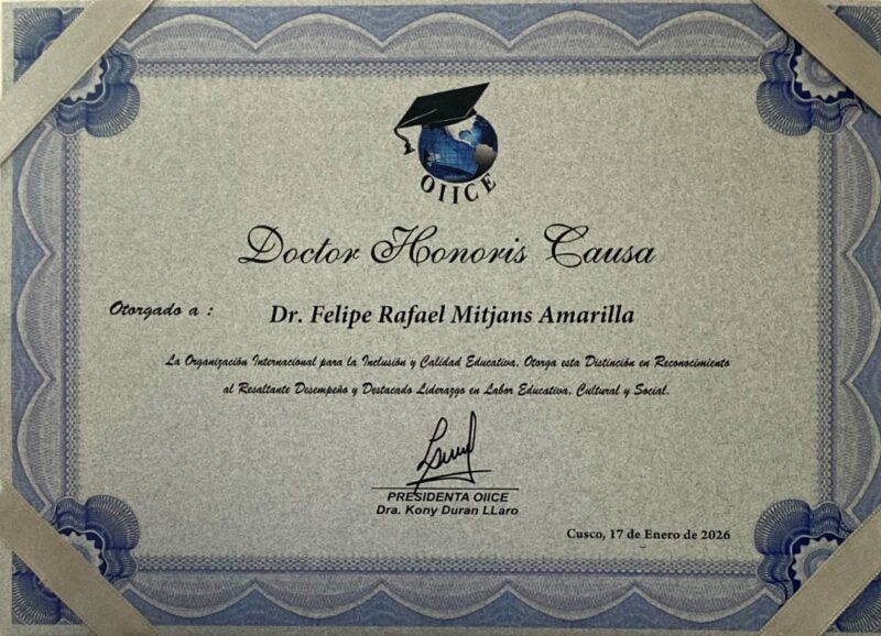 El Dr. Felipe Mitjans, Docente Investigador adscrito al Departamento de Ingeniería Mecánica y Electromecánica de la Facultad de Ingeniería de la Universidad Nacional de Asunción (FIUNA), fue distinguido por la Organización Internacional para la Inclusión y Calidad Educativa (OIICE). La ceremonia de entrega se realizó el 17 de enero de 2026 en la ciudad de Cusco, Perú.