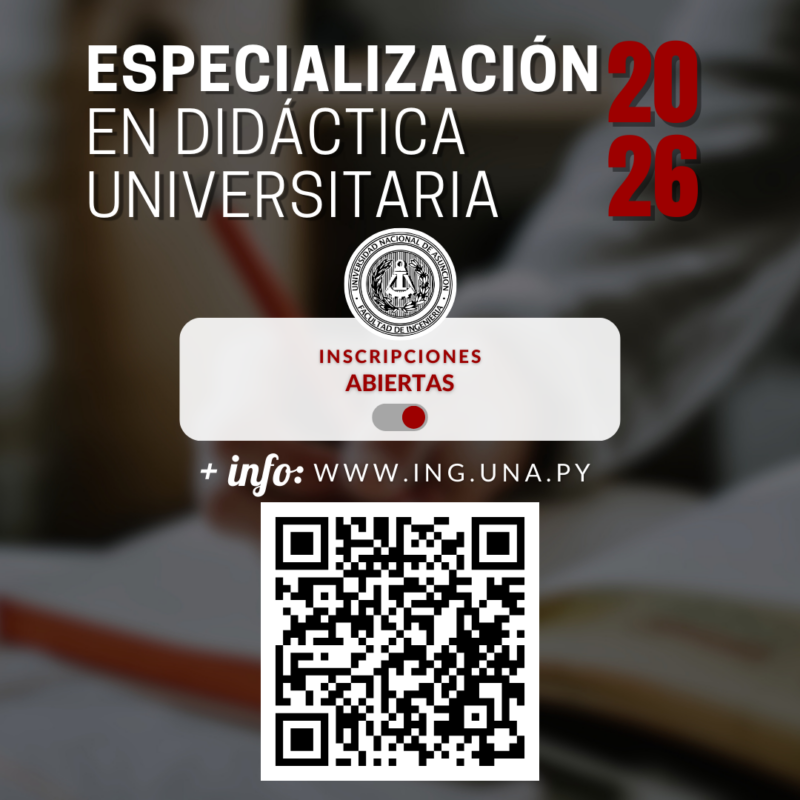 La Facultad de Ingeniería de la Universidad Nacional de Asunción (FIUNA), convoca a egresados del Curso de Capacitación en Didáctica Universitaria del período 2015 al 2026, a realizar el Curso de Especialización en Didáctica Universitaria a ser desarrollado en la modalidad presencial | Primera Convocatoria – 1ra Sección Año 2026.