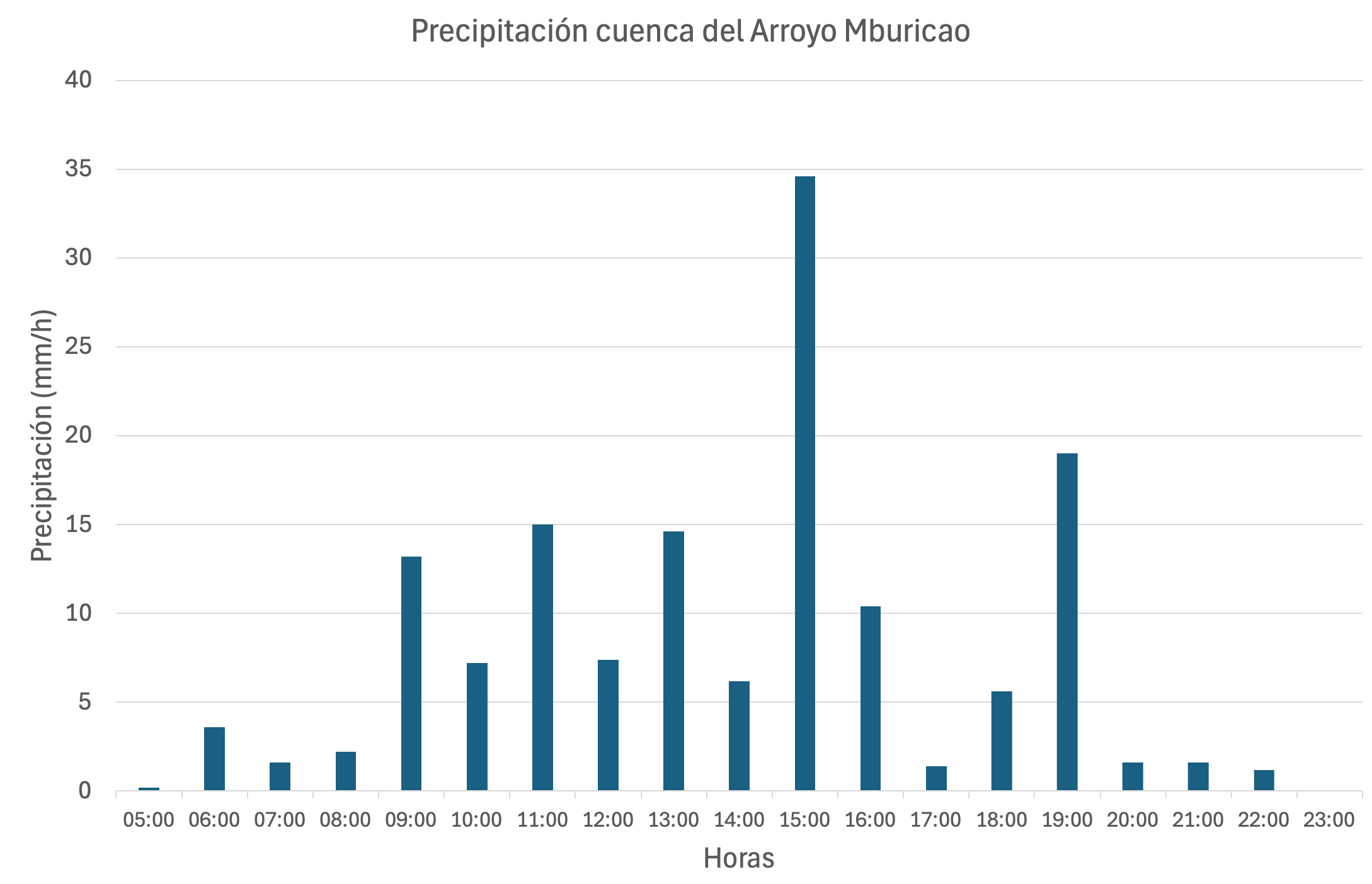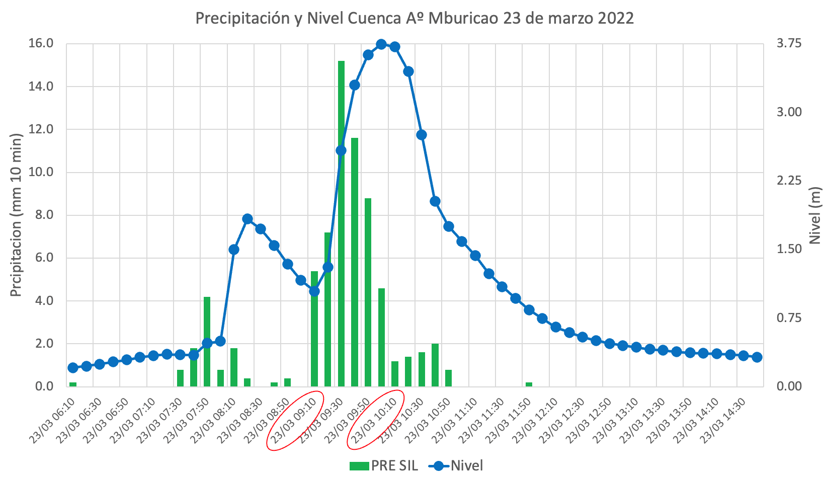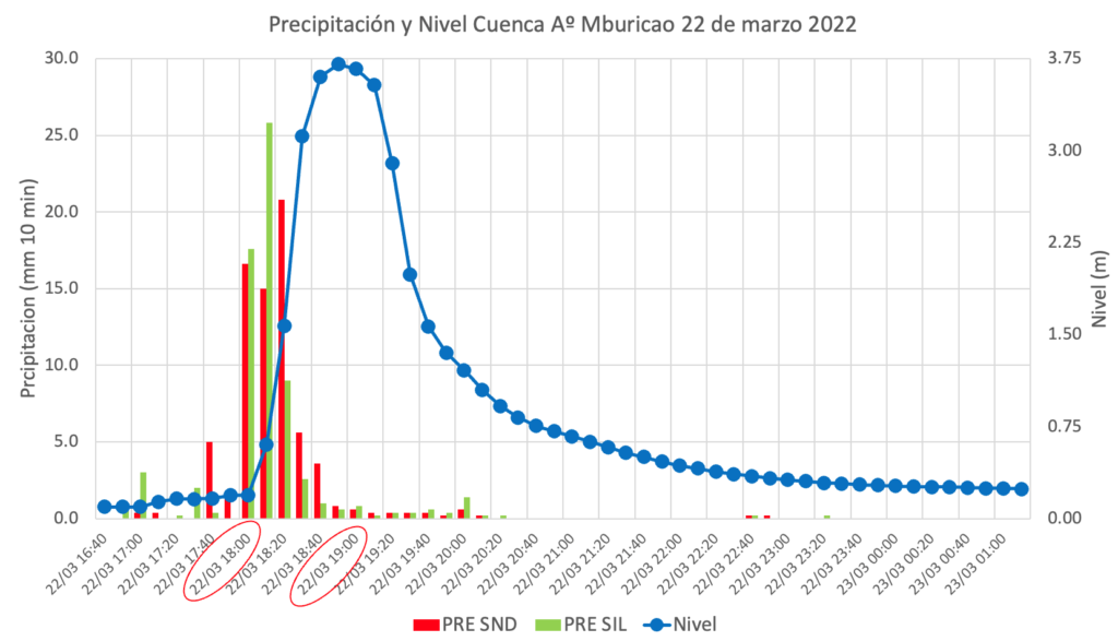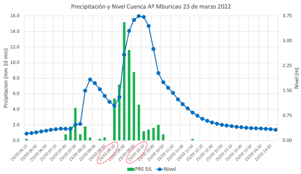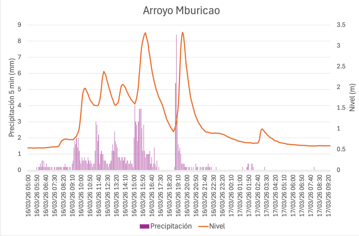Se presentan los registros de nivel y precipitación del arroyo Mburicao para el 16 de marzo cada 5 minutos donde el nivel máximo alcanzado por el arroyo fu de 3,3 m a las 16:00 y 19:30 con intensidades de 29 mm/h y 20 mm/h respectivamente. Toda esta información y la de los demás eventos registrados desde agosto 2025 están siendo utilizados para calibrar modelos con los cuales pronosticar el nivel de arroyo en función a las lluvias y de esta manera emitir alertas tempranas a la población.