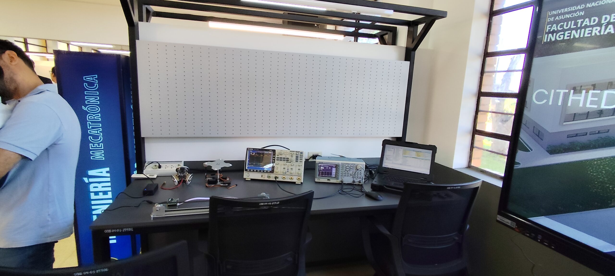 Durante el acto protocolar en el Salón Auditorio del CITEC, presidido por el Decano, Prof. Dr. Ing. Rubén López Santacruz, el Director del Departamento de Ingeniería Electrónica y Mecatrónica (DIEM), Prof. Dr. Ing. Raúl Gregor, compartió los pormenores de lo que calificó como un «desafío institucional». Gregor relató cómo, tras identificar la falta de infraestructura para investigación a pesar del potencial industrial del país, se gestionó una inversión de 100.000 USD de fondos propios de la Facultad. Este presupuesto, ejecutado en un tiempo récord de ocho meses, permitió la adquisición de equipos críticos para la formación de profesionales de alto nivel científico.