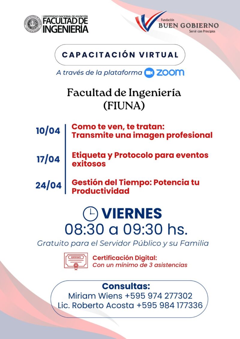 El Departamento de Desarrollo, Capacitación y Evaluación Administrativa, dependiente de la Dirección de Gestión de Talento Humano de la Facultad de Ingeniería de la Universidad Nacional de Asunción (FIUNA) invita a directivos, colaboradores de la Institución y sus familiares a participar de los Cursos de capacitación impartidos por la Fundación Buen Gobierno (FBG), en el marco del Convenio de Cooperación Interinstitucional. Se desarrollarán en la modalidad virtual por medio de la plataforma ZOOM.