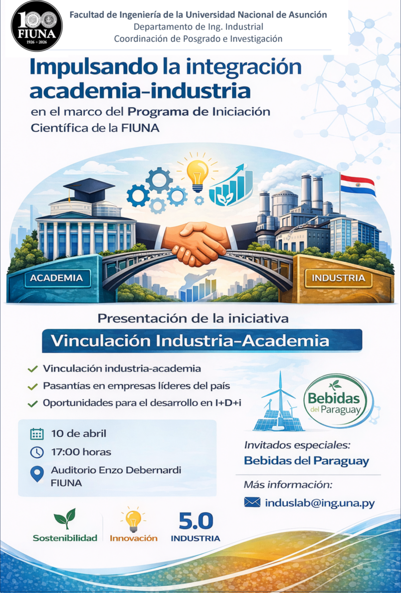 La Facultad de Ingeniería de la Universidad Nacional de Asunción (FIUNA), a través del Departamento de Ingeniería Industrial y el Laboratorio de Producción y Métodos, organiza un evento orientado a fortalecer la vinculación entre la academia y el sector productivo industrial. El evento ha sido reprogramada y se publicará próximamente la nueva fecha.
