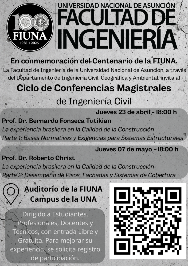 En el marco de las actividades conmemorativas por el Centenario de la Facultad de Ingeniería de la Universidad Nacional de Asunción (FIUNA), el Departamento de Ingeniería Civil, Geográfica y Ambiental (DICGA) invita a la comunidad académica y al público en general a participar del Ciclo de Conferencias Magistrales de Ingeniería Civil.
