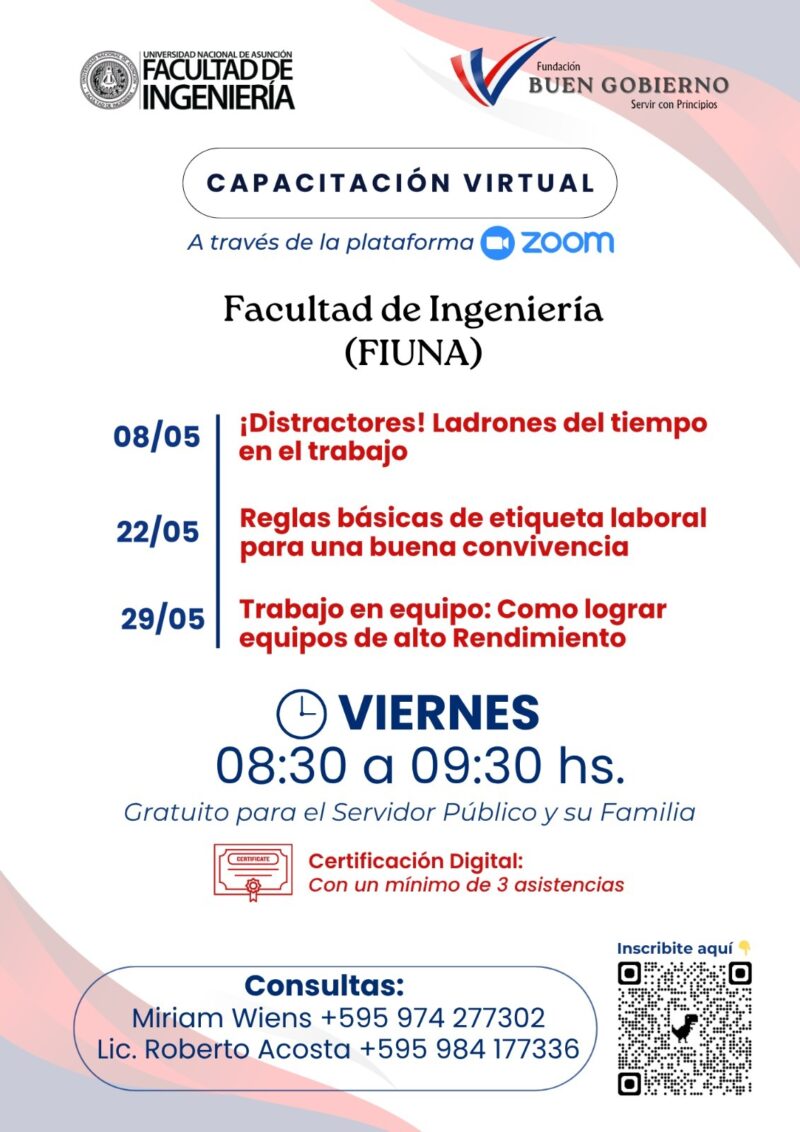 El Departamento de Desarrollo, Capacitación y Evaluación Administrativa, dependiente de la Dirección de Gestión de Talento Humano de la Facultad de Ingeniería de la Universidad Nacional de Asunción (FIUNA) invita a directivos, colaboradores de la Institución y sus familiares a participar de los Cursos de capacitación impartidos por la Fundación Buen Gobierno (FBG), en el marco del Convenio de Cooperación Interinstitucional. Se desarrollarán en la modalidad virtual por medio de la plataforma ZOOM.