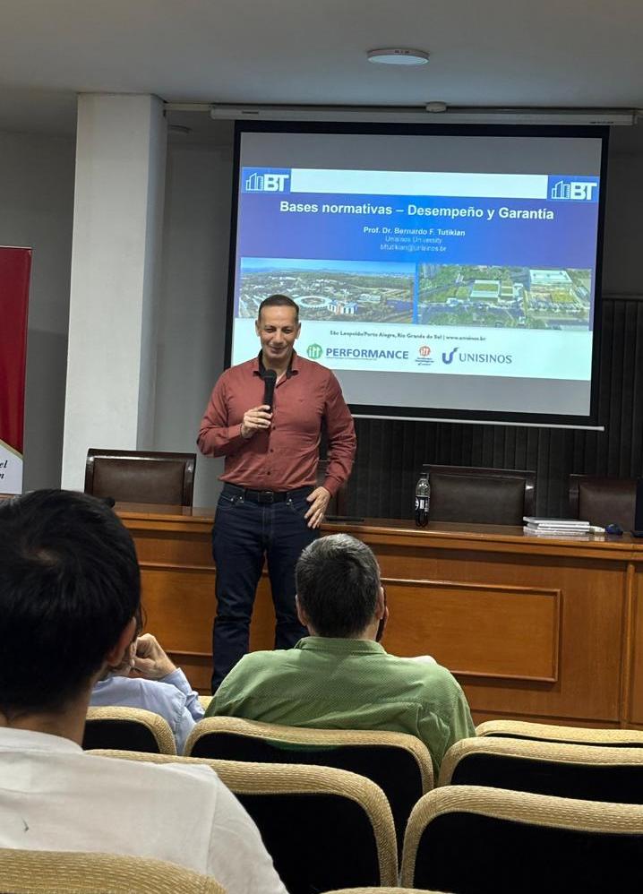 Durante su exposición, el Prof. Tutikian abordó el enfoque brasileño en materia de calidad en la construcción, destacando la importancia de una visión integral basada en el desempeño de las edificaciones a lo largo de su ciclo de vida. En este sentido, presentó el marco normativo vigente en Brasil, haciendo especial énfasis en la norma ABNT NBR 15575, orientada al desempeño de edificaciones habitacionales, así como en otras normas complementarias vinculadas a mantenimiento, inspección, reformas y manuales de uso de edificaciones .
